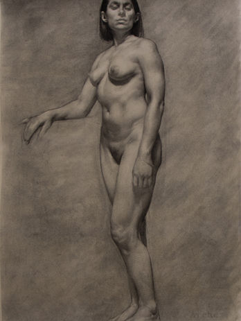 The process begins with the block-in stage, aiming to capture character and examination of proportion, structure, and simple light and shadow. After the block in, students will begin modeling and articulating the forms through a consideration of volume, light and anatomy. Students will hone their abilities and knowledge with the guidance of master draftsmen in real time and in the company of the likes of John Singer Sargent, Andrew Wyeth and Edgar Maxence. On breaks they will journey to